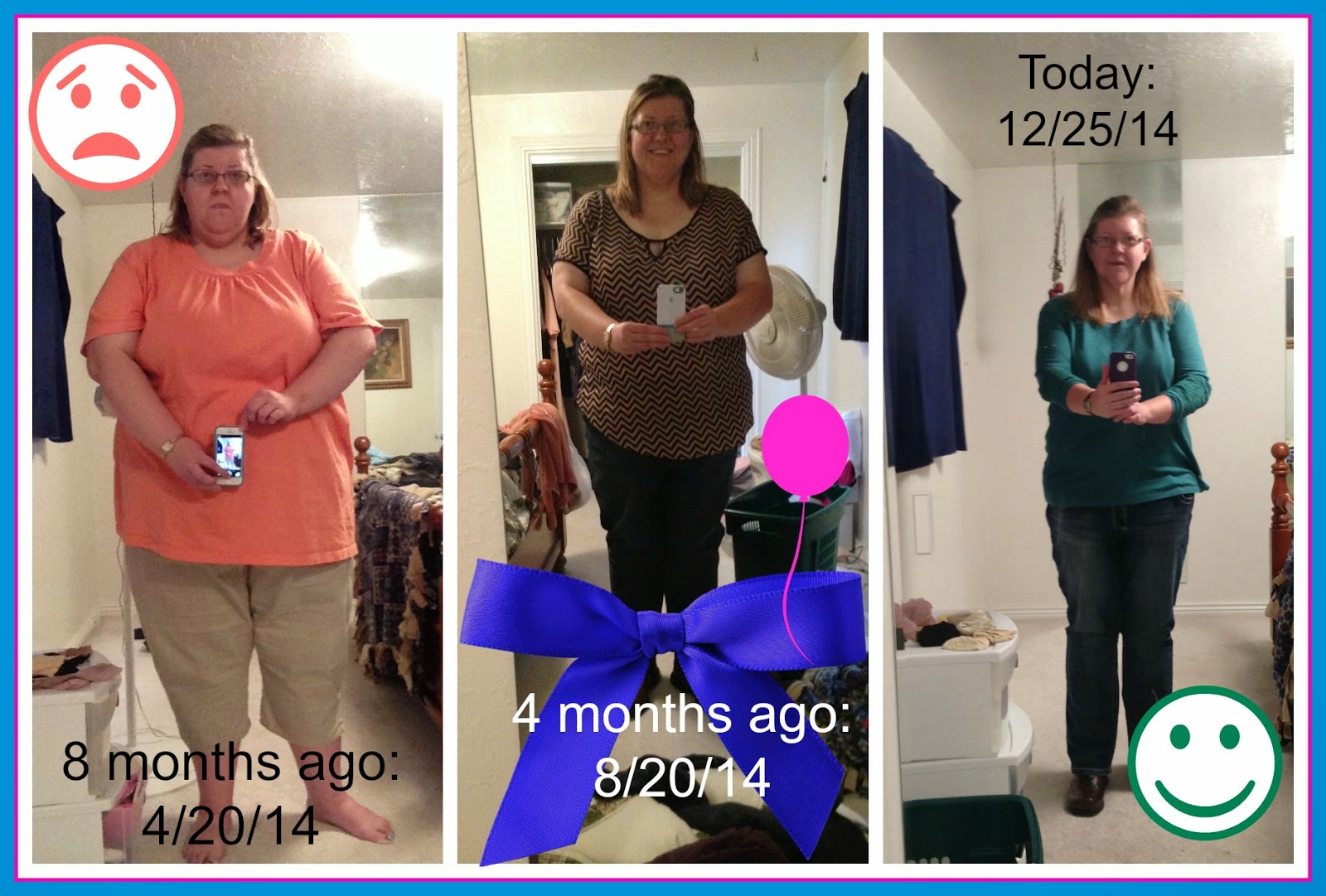 About 4 months ago, I took a picture of myself and put it alongside my "before" picture as a way of seeing how far I had come. It was the picture that made me cry… because it was the first time I had truly been able to see a change. I can't remember who said it… but someone told me then to just wait until it had been 8 months and see how it compared. For whatever reason that stuck in my mind and I wanted to do another picture at 8 months and put it side by side with the other two. Tonight I finally took that 8 month picture and put it side by side with the other two.